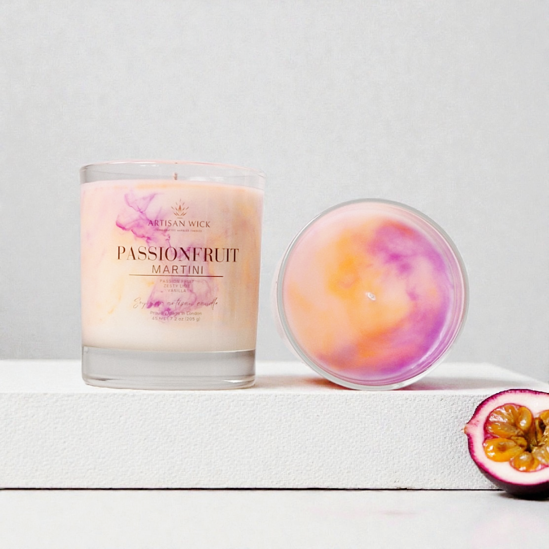 Indulge in the comforting warmth and enriching aroma of this Artisan Wick "Passionfruit Martini" Soy Wax Candle. This glass container candle is perfect for adding a touch of modern elegance to any room in your home, and is made from high quality soy wax, which burns evenly and emits a delightful scent of passion fruit, zesty lime, and vanilla.