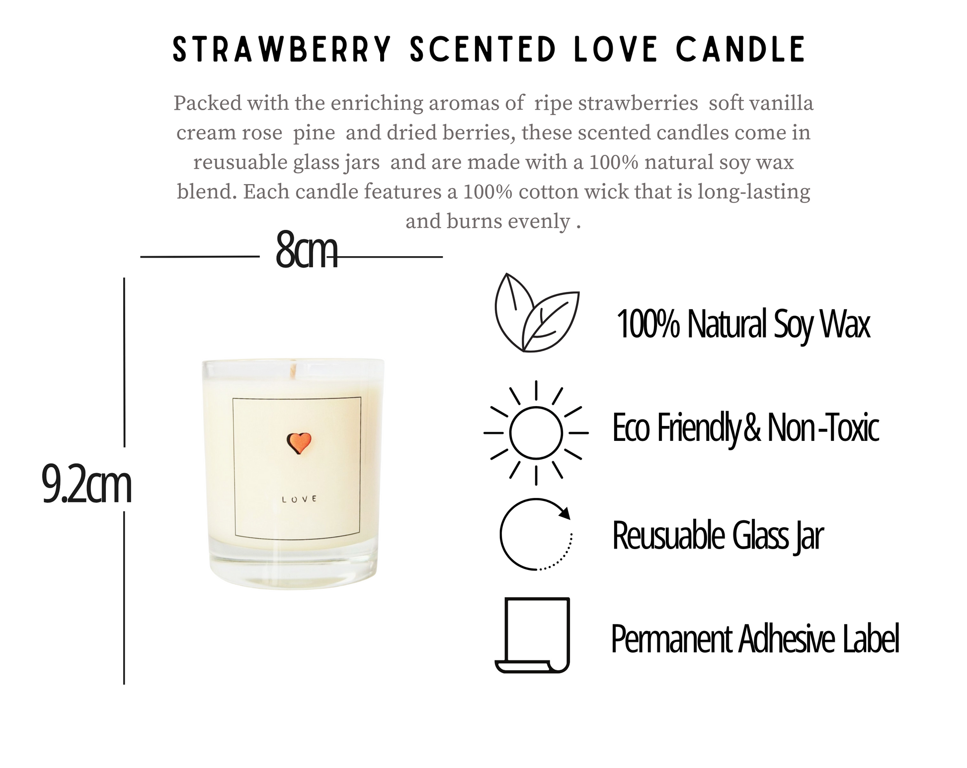 Ignite the sweet spark of romance with our Strawberry Love Candle. A luscious blend of ripe strawberries, soft vanilla cream, and a whisper of rose petals, pine and dried berries. Each candle is hand-poured in small batches using 100% natural soy wax and a lead-free cotton wick for a clean, long-lasting burn.